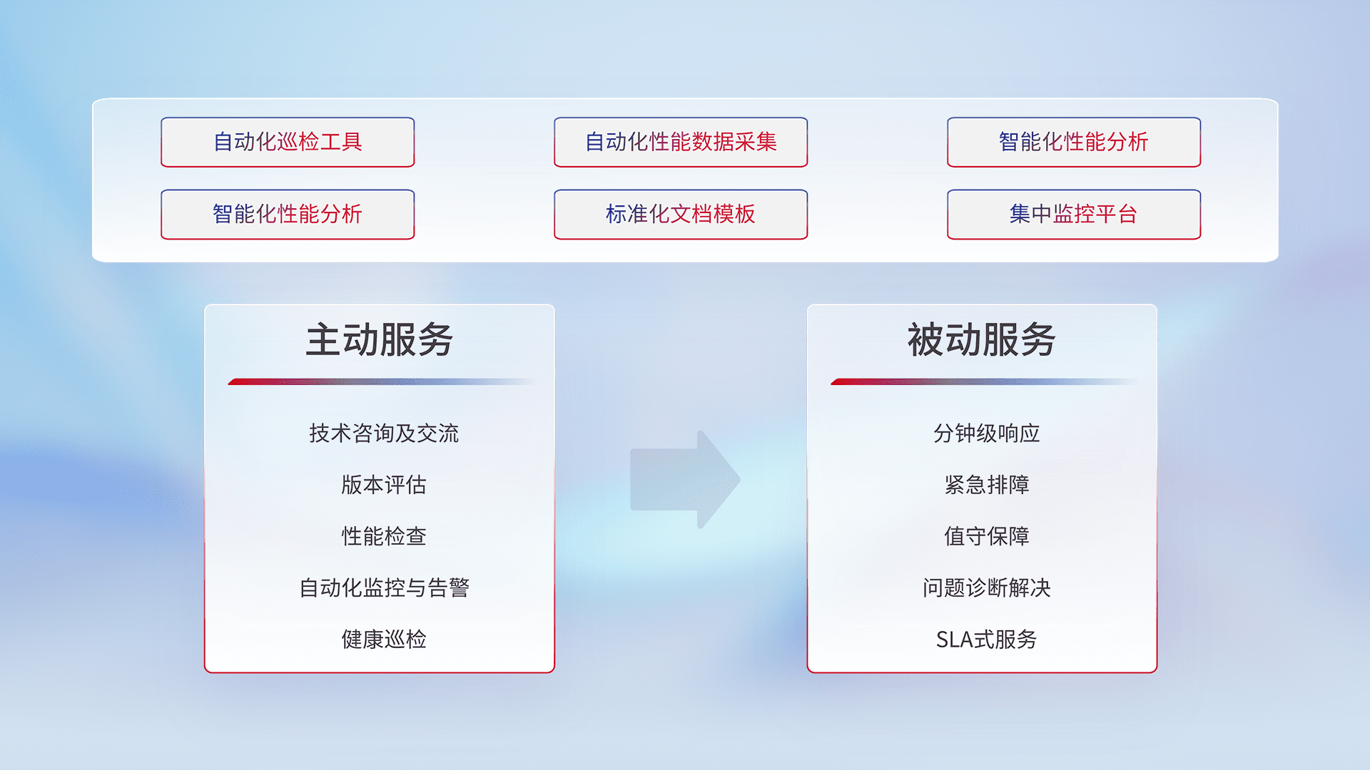 智能化工具和标准化文档,,,保障服务质量,,,,提供主动服务(包含技术咨询、、、版本评估、、性能检查、、自动化监控与告警、、、、健康巡检)和被动服务包含(分钟级响应、、、、紧急排障、、、值守保障、、问题诊断解决、、、SLA服务)。。